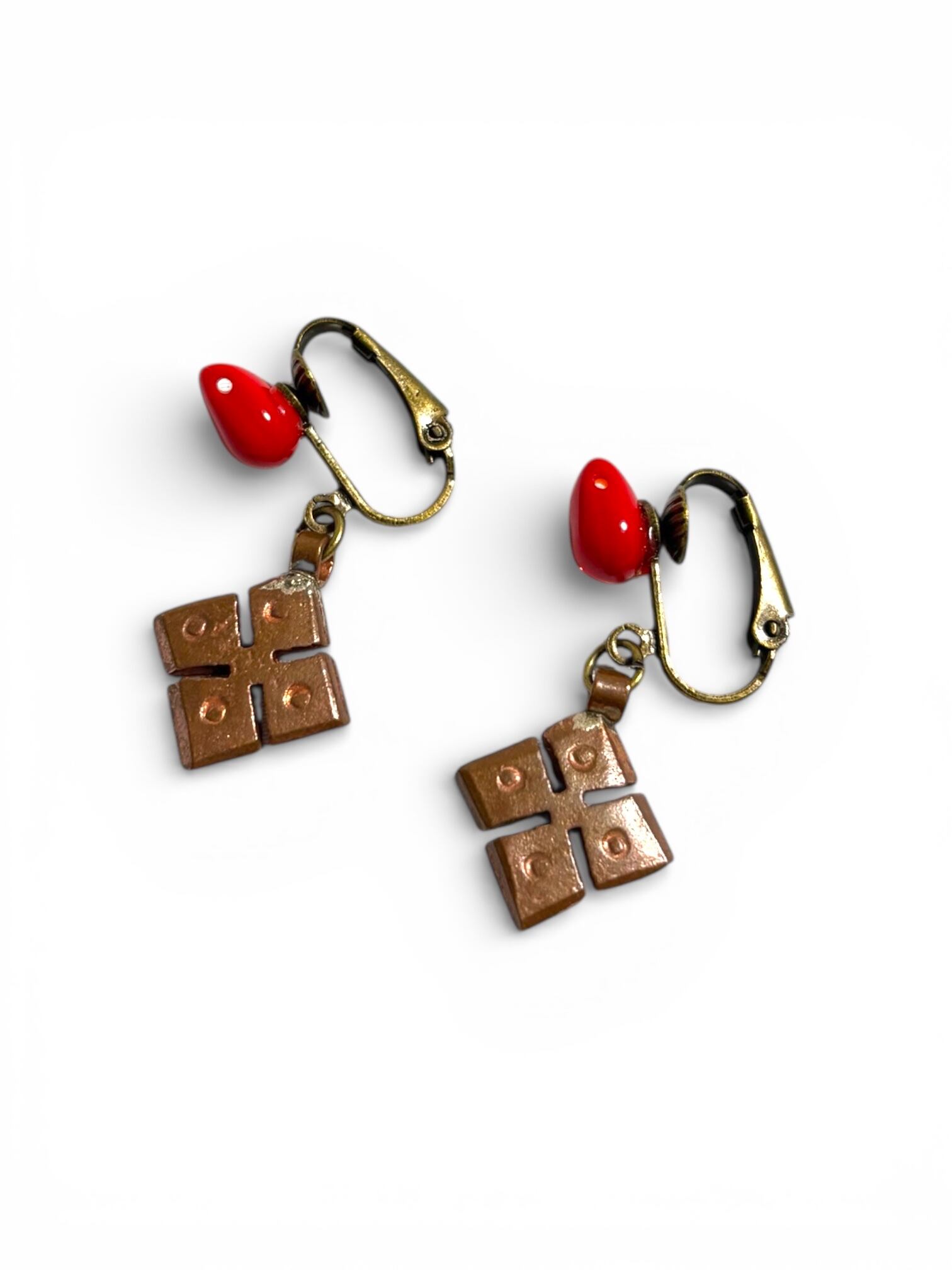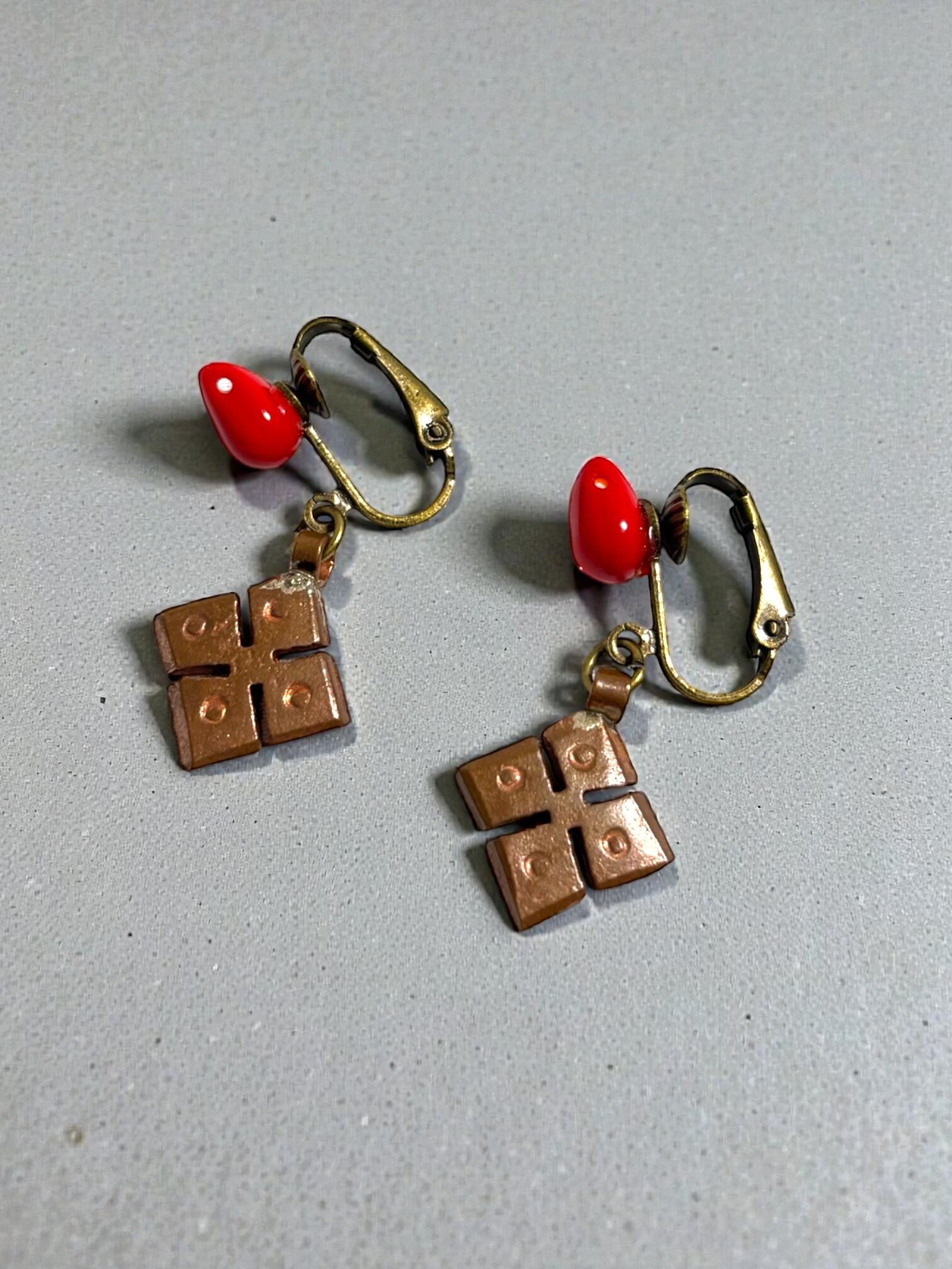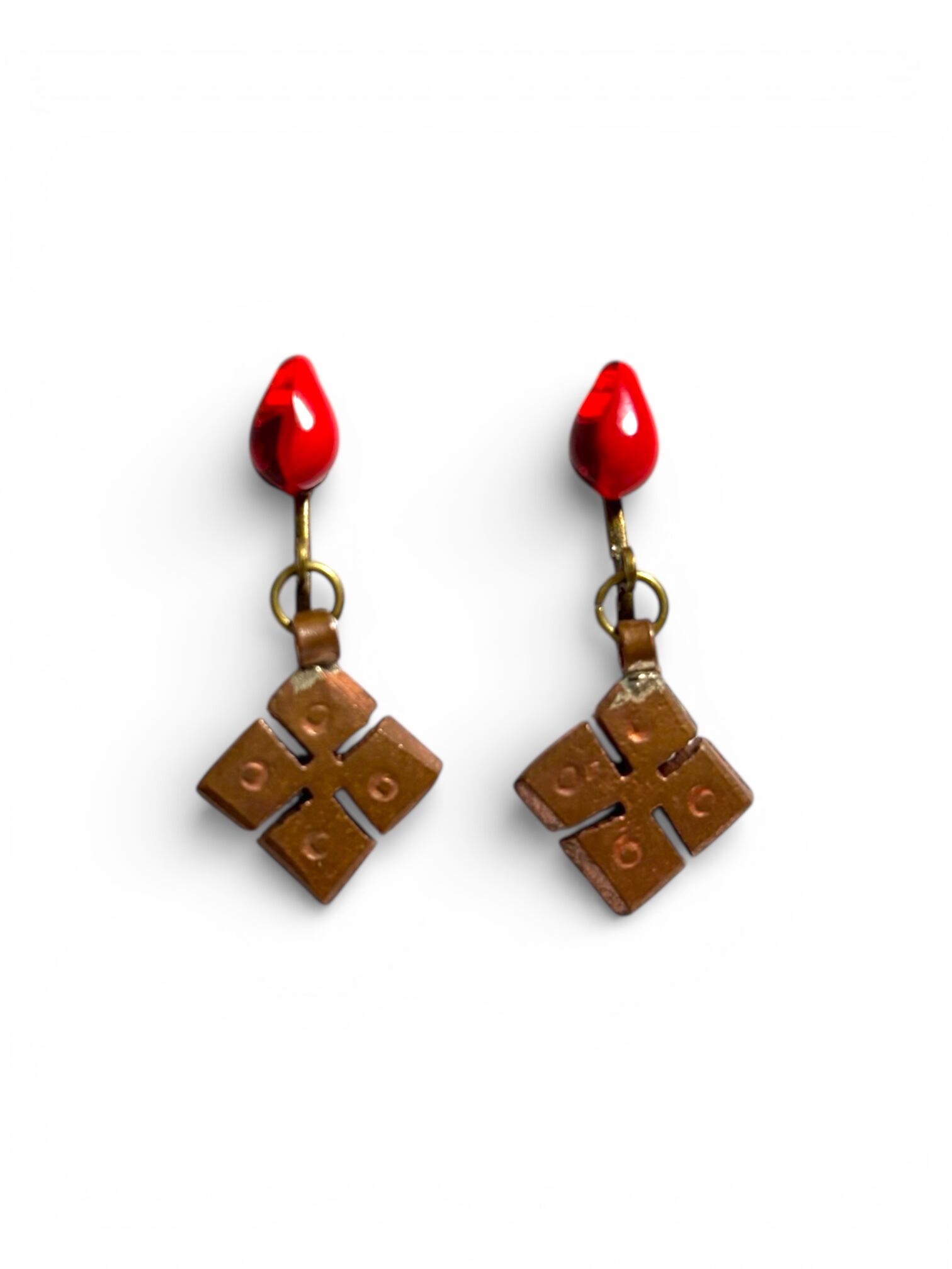 ビビッドレッドのドロップビーズとエチオピアンクロスのイヤリング