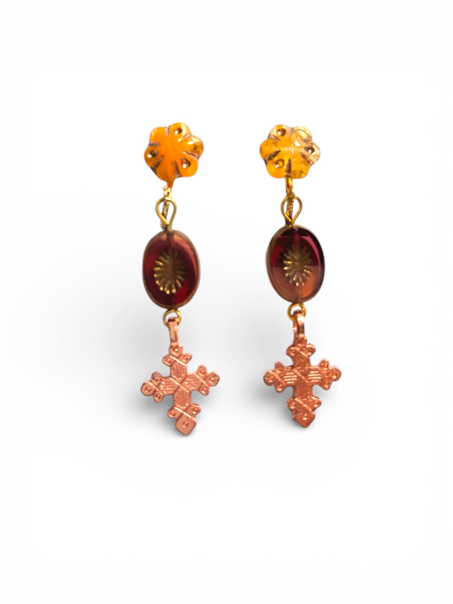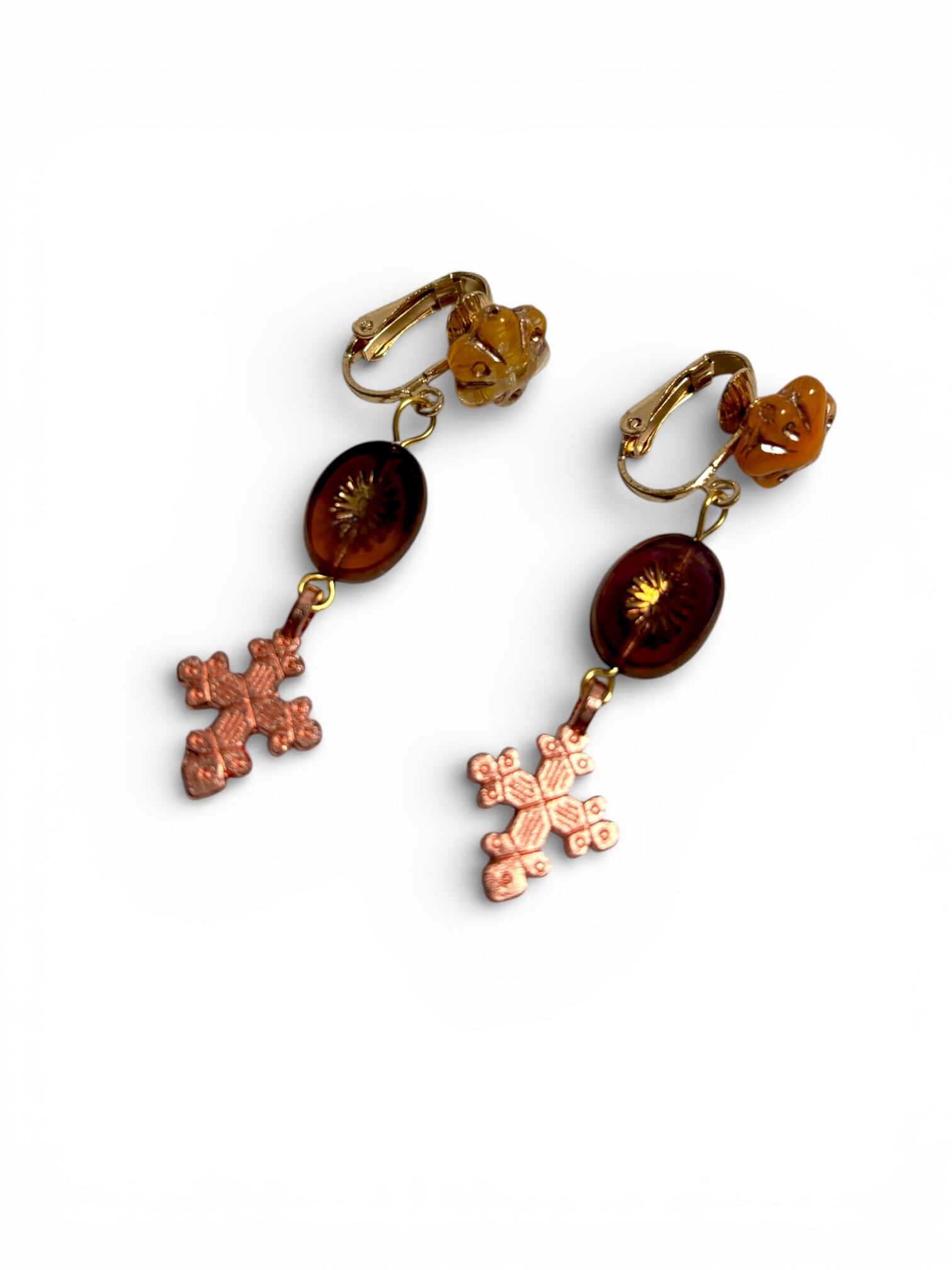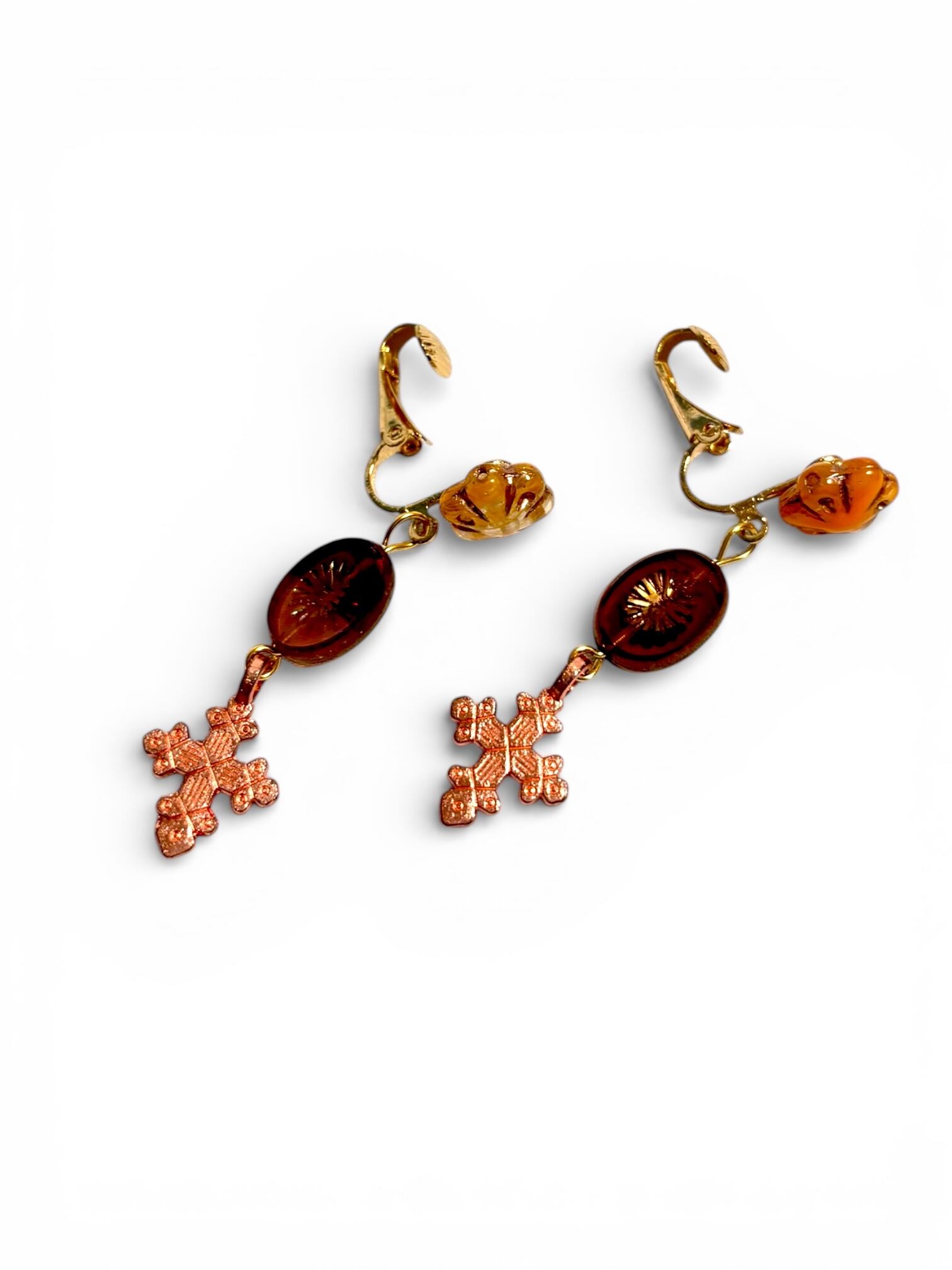 マホガニーとイエローフラワーチェコビーズ×クロスのイヤリング
