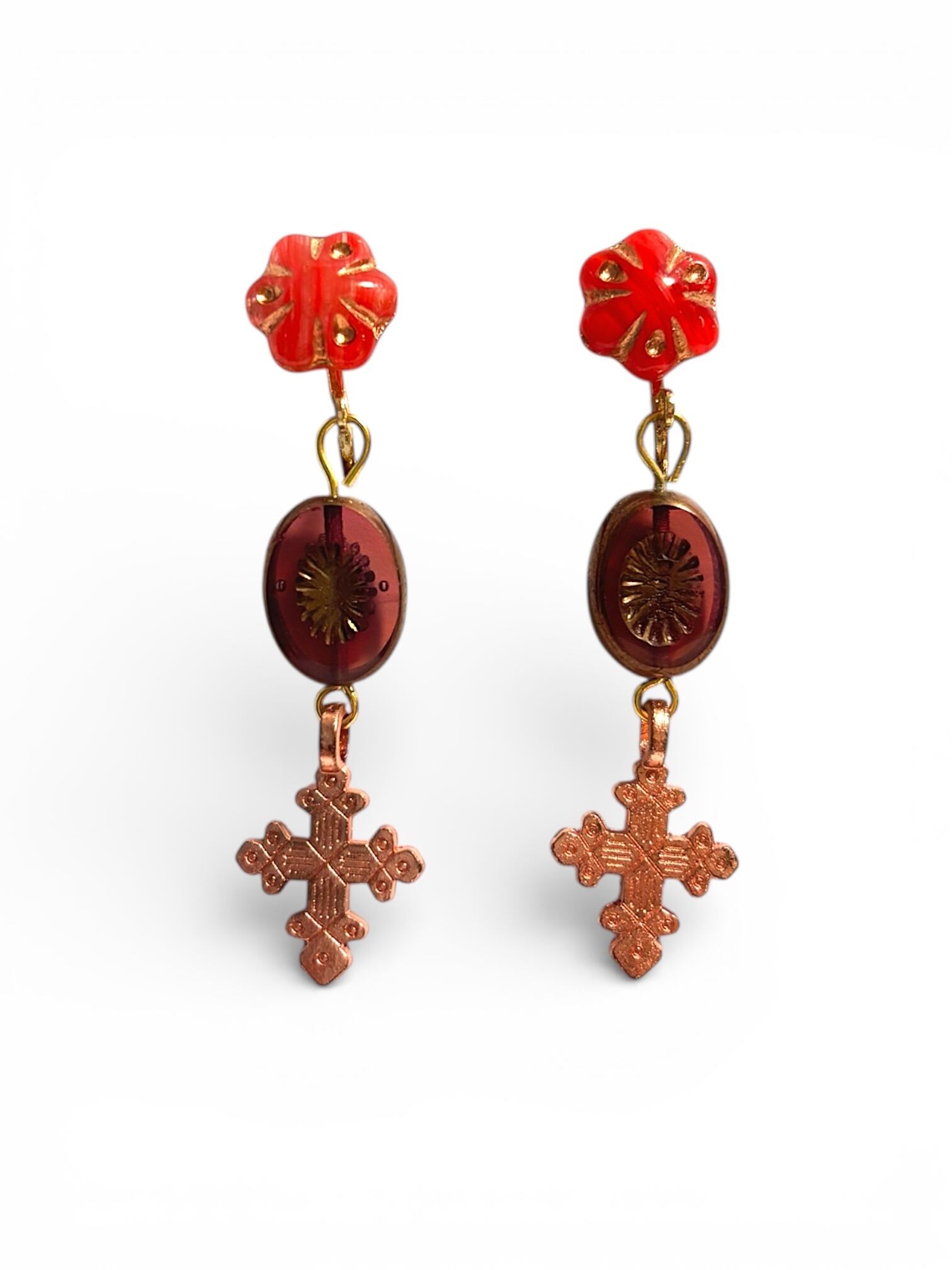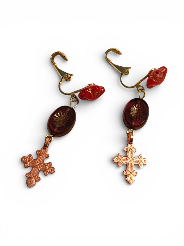 マホガニーとレッドフラワーチェコビーズ×クロスのイヤリング